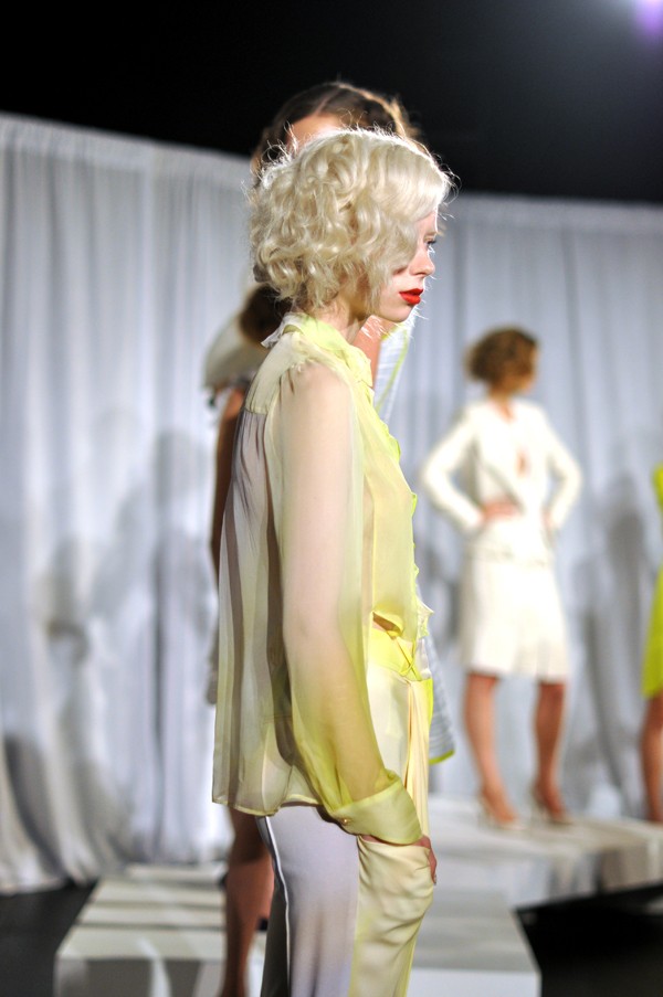 The colors were striking at the Joy Cioci show! My two favorite pieces were the first two photos. The sheer yellow blouse and the yellow t shirt dress. Both have such great details but still are so wearable and classic. I also LOVED the fresh faced makeup, pop of a punchy lip and the romantic hair curls.