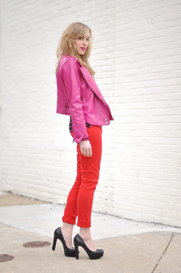These red skinnies were the perfect match to this tough hot pink leather jacket.