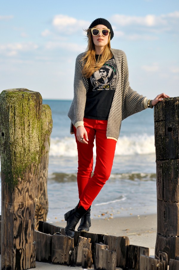 Last holiday weekend I got to take a mini escape from city living and headed to the beach. It is the little things that make me happy and walking on the beach is one of them. I have always been a huge Bob Dylan fan and a few years back got to hear him perform at a concert. Epic, epic time and I am glad to have this shirt as a memory. Layering an oversized knit with a funky shape was just what this simple jeans and tee look needed. I also was dying to wear my new ring. Part beauty, part danger… I am OBSESSED. Although.. I need to be careful not to poke an eye out. The price I pay for wearing such a beautiful piece of jewelry. Hope everyone takes some time out of their weekend to slow down and stop and smell the roses.