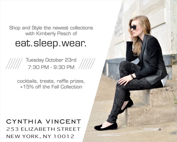 Hey New Yorkers! I am hosting a fun event at the Cynthia Vincent Store in Soho next Tuesday October 23rd from 7:30 PM-9:30 PM. Get your shop on, have some treats and enjoy 15% off the Fall Collection. Looking forward to seeing you there! (FYI the blazer I am wearing in the photo above is Cynthia Vincent and I am obsessing. Come find some fall goodies with me!)