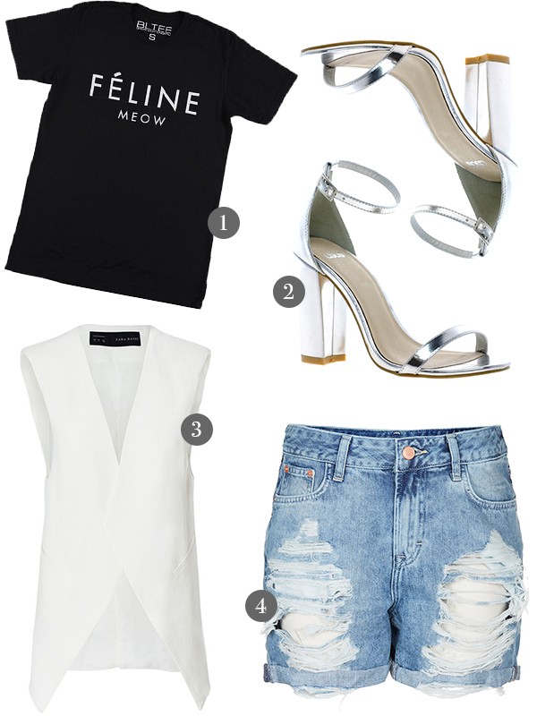 1. Brian Lichtenberg t-shirt (love it in white too!) / 2. asos heels / 3. zara vest / 4. topshop shorts