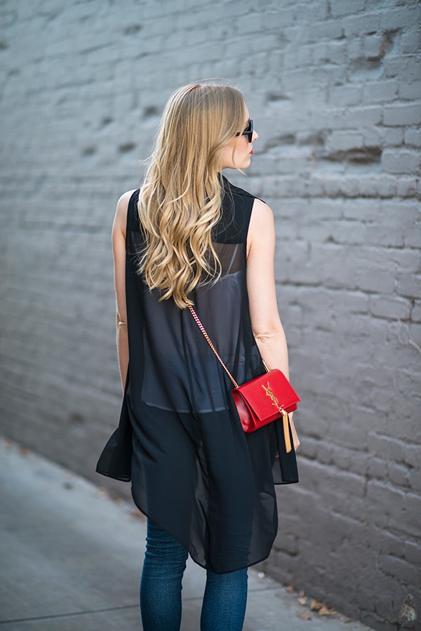 So basically I have not taken these sneakers off since I got them. They have become my everyday go-to for running around. Also tried something different by wearing my button down tank open and layering a cami underneath. Digging how light and airy this is. Again I am in all black and white similar to this look, but still using this magic bag as a pop of color. Little YSL baby, you are too good to me.