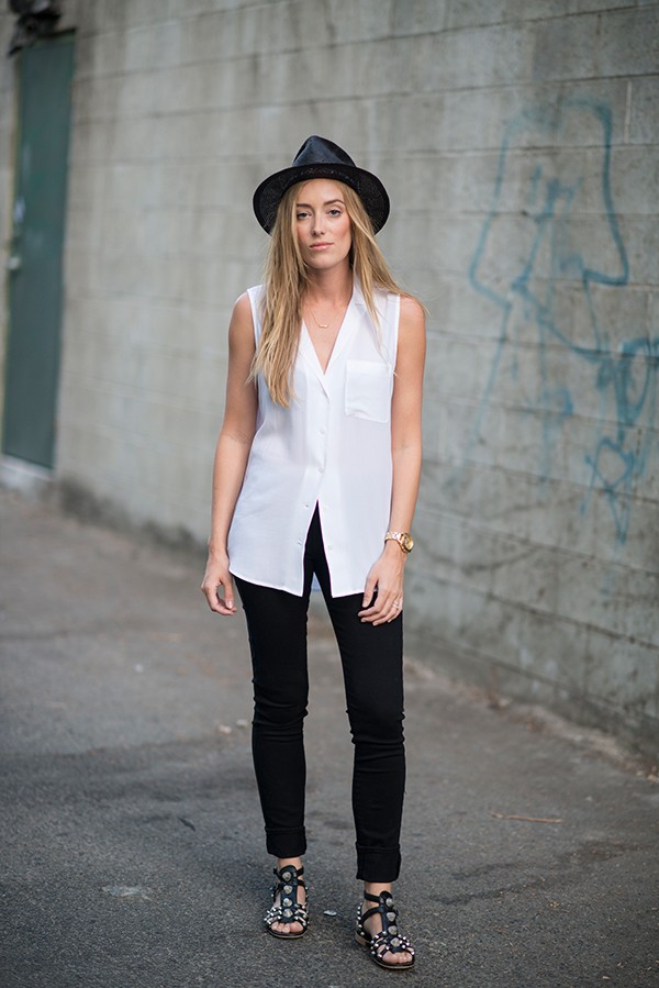 I would like to think I was having a major Michael Jackson moment this day. Black and white dressing for me has kind of just become a default. It’s so chic and easy. I am excited to be partnering up with one of my fav denim lines A GOLD E in celebrating of their Piperlime launch. I previously wore this boyfriend pair on the blog and fell in love with the fit. So I was excited to try one of their skinny pairs. Black denim is going to start finding it’s way into my closet as Fall quickly approaches. It was all about the summer styling here with a simple white silk blouse and some edgy accessories. What denim pieces are you getting excited about as Fall is approaching? Would love to hear all about it in the comments below.
