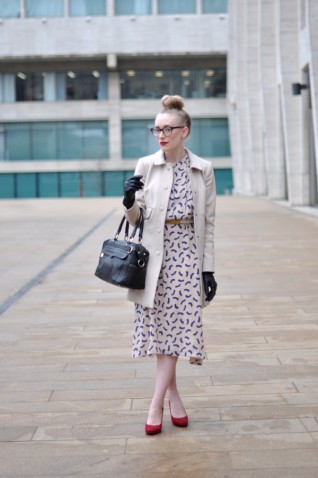![]() [dress: vintage / belt: moVintage / jacket: club monaco / shoes: franco sarto / glasses: c/o warby parker / bag: c/o rebecca minkoff] This dress is by far one of my favorite vintage finds. The longer hem and graphic pattern made this a…